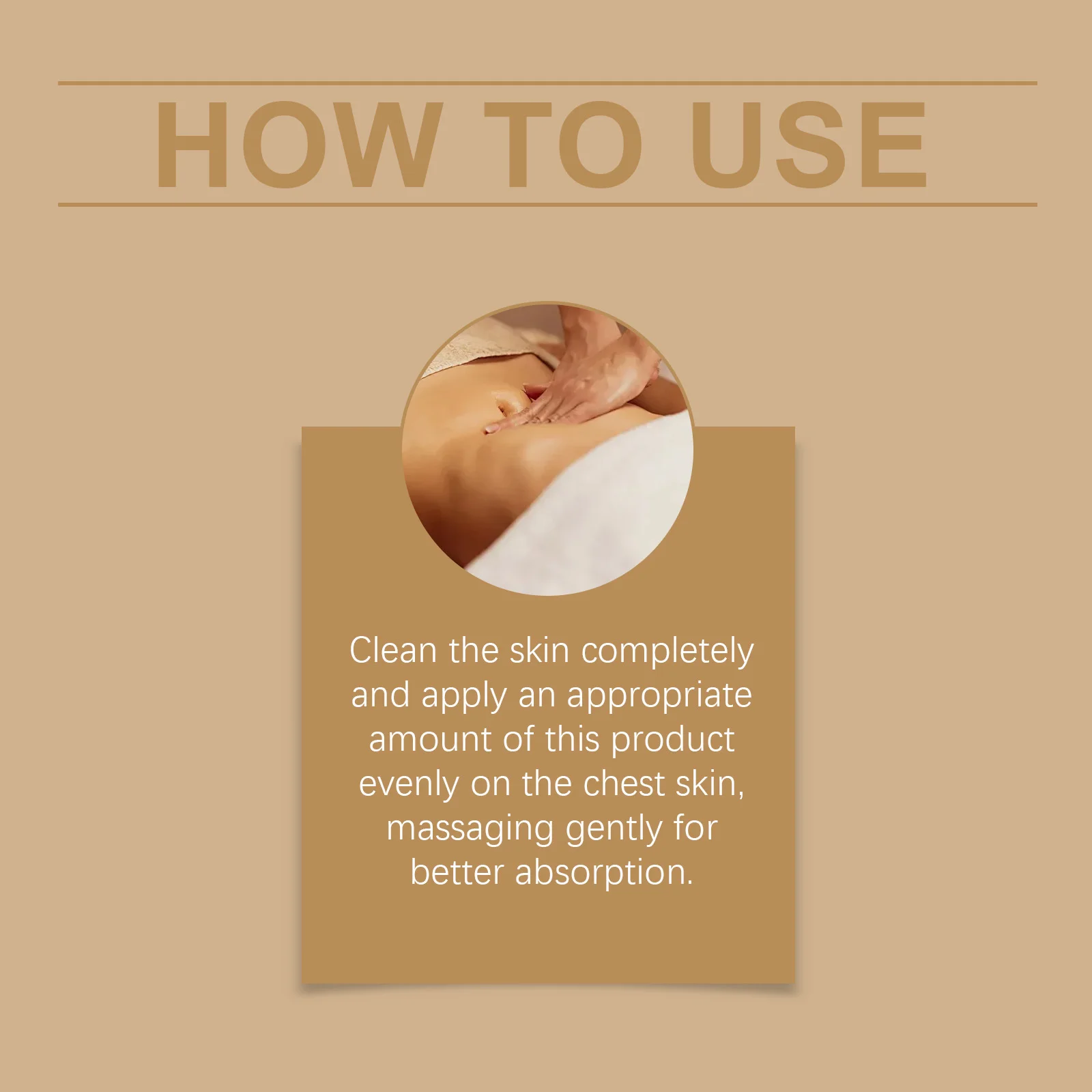 Clean the skin completely and apply an appropriate amount of this product evenly on the chest skin, massaging gently for better absorption.